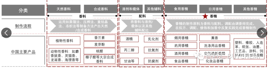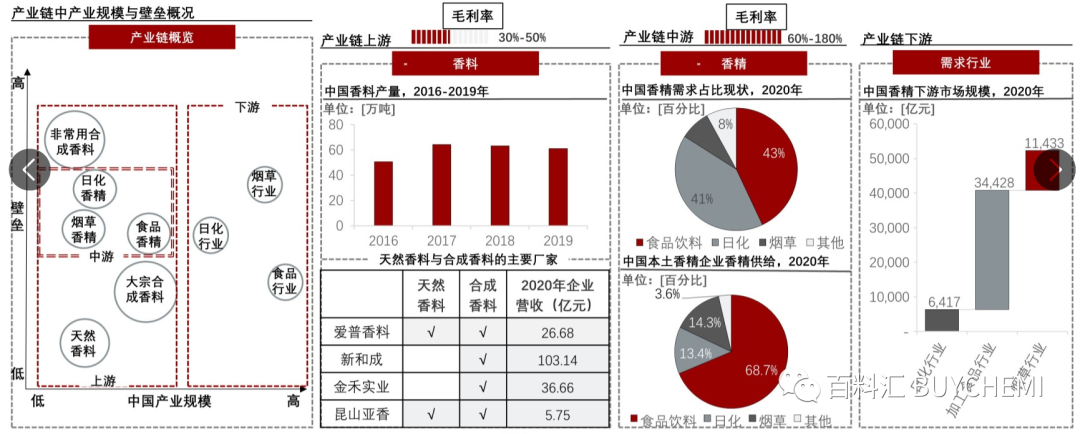 中國香精香料行業(yè)上游產業(yè)鏈為香料種植與生產,中游為香料生產,下游為日化、食品和煙草應用行業(yè)。其中香料與香精產量處同等水平。