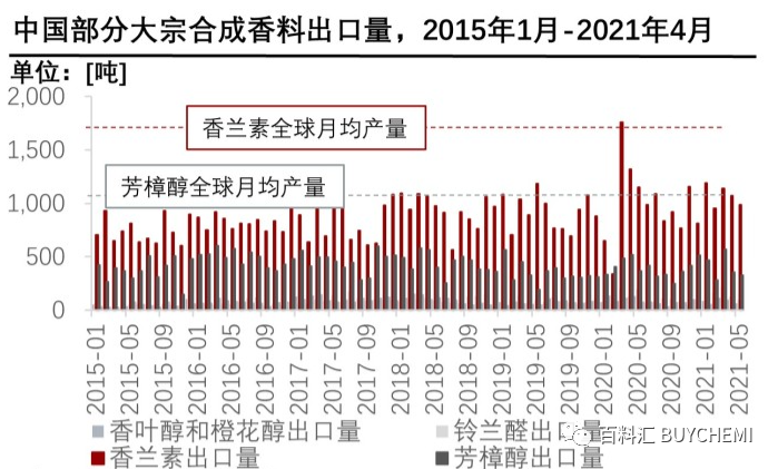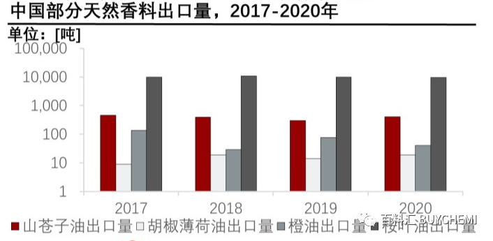 中國的大宗合成香料產量在國際上占比高、出口數(shù)量多。每年中國香精香料產品約1/3用于出口,其中香料產品約2/3用于出口。