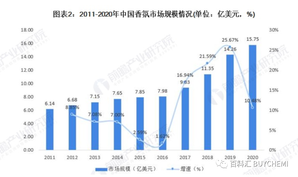 2011-2016年,由于使用香氛在國(guó)內(nèi)還未形成普遍的消費(fèi)習(xí)慣,故市場(chǎng)規(guī)模相比其他日化子類較低。但是,2016年后,隨著中產(chǎn)階級(jí)人口逐漸增多,香氛產(chǎn)品作為能夠襯托出生活品質(zhì)的產(chǎn)品,香氛市場(chǎng)銷售量呈現(xiàn)爆發(fā)式上漲。與此同時(shí),在個(gè)性化的當(dāng)下,氣味個(gè)性化成為了消費(fèi)者展現(xiàn)自我的一種表達(dá)方式,對(duì)香氛的需求也逐漸增多,2020年我國(guó)香氛市場(chǎng)規(guī)模達(dá)到了15.75億美元,疫情沖擊下市場(chǎng)規(guī)模同比增長(zhǎng)率仍然達(dá)到10.48%。
