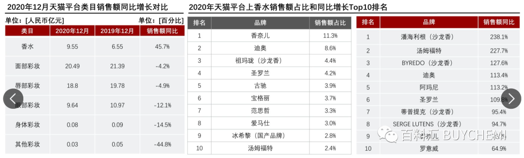 與2019年12月相比,2020年由于疫情需要佩戴口罩,臉部被遮擋導(dǎo)致消費(fèi)者化妝需求減少。作為個(gè)人風(fēng)格和精致度的體現(xiàn),香水在疫情期間成為彩妝的替代品,2020年12月香水的銷售額同比增長(zhǎng)45.7%。