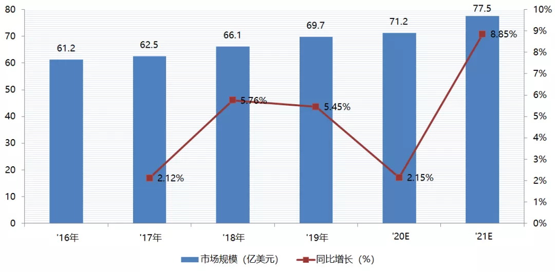 數(shù)據(jù)顯示,截至2019年中國香料香精行業(yè)市場規(guī)模為69.7億美元,同比增長5.45%,預計在政策以及下游需求不斷驅(qū)動下,到2021年中國香料香精行業(yè)市場規(guī)?;蚩蛇_77.5億美元。