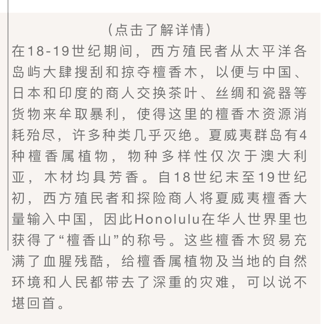 上乘的檀香木需百年成材,六十年以上剛能稱為老樹,一般砍伐后還要放置三十至四十年,木性才能真正達到醇化,氣味達到沉穩(wěn)溫和。但誰又能等到那么久呢,現(xiàn)在市面上能看見樹齡在三十年以上的檀香木已經(jīng)很少,更別提醇化的時間。大量千百年才積累的檀香木在幾年間要么被制作成工藝品,要么化作一縷縷輕煙飄散,地球上天然的檀香資源幾乎已經(jīng)消耗殆盡。