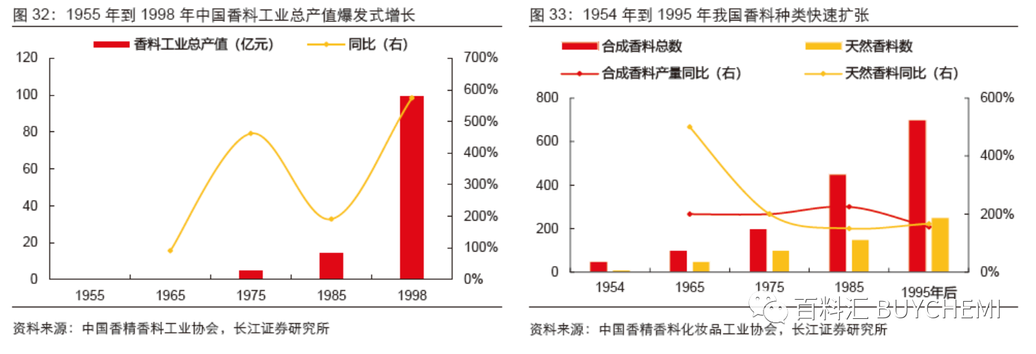快速發(fā)展階段(1980-1999):改革開放后,中國的合成香料工業(yè)進入快速發(fā)展階段。此階段,我國合成香精香料主體從國營企業(yè)逐步走向市場化,民間資本進入香料工業(yè),促進香料工業(yè)進入爆發(fā)式增長階段。同期,我國合成香料和天然香料種類數(shù)量快速擴張,新型合成香料如乙基麥芽酚、甲基紫羅蘭酮、多環(huán)麝香、大環(huán)麝香等開始逐步涌現(xiàn)。