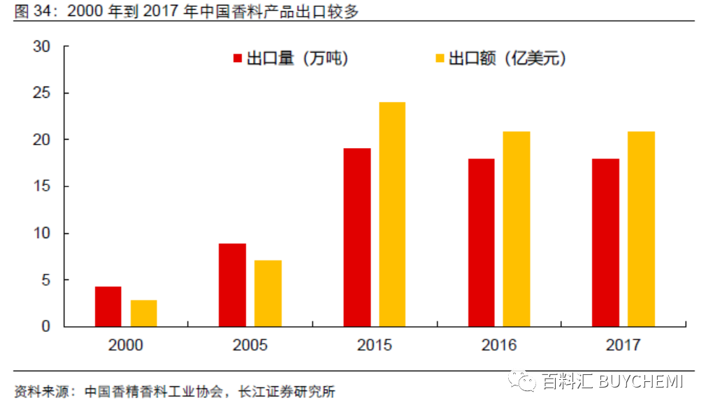 國際競爭階段(2000-至今):新世紀(jì)以來,我國化學(xué)合成工藝和分析儀器取得了較大突破,香精香料產(chǎn)品質(zhì)量進一步提升,產(chǎn)品種類得到進一步豐富,產(chǎn)量進一步擴大,市場空間進一步釋放。加入WTO 后,我國合成香料產(chǎn)業(yè)開始逐步參與國際市場競爭,我國在合成β-苯乙醇、苯甲醛、香草醛等香精香料產(chǎn)品建立起自身的競爭優(yōu)勢,逐步由進口依賴轉(zhuǎn)向為出口發(fā)展模式。此階段,中國在大宗香精香料產(chǎn)品形成一定成本優(yōu)勢,在世界香精香料行業(yè)嶄露頭角。