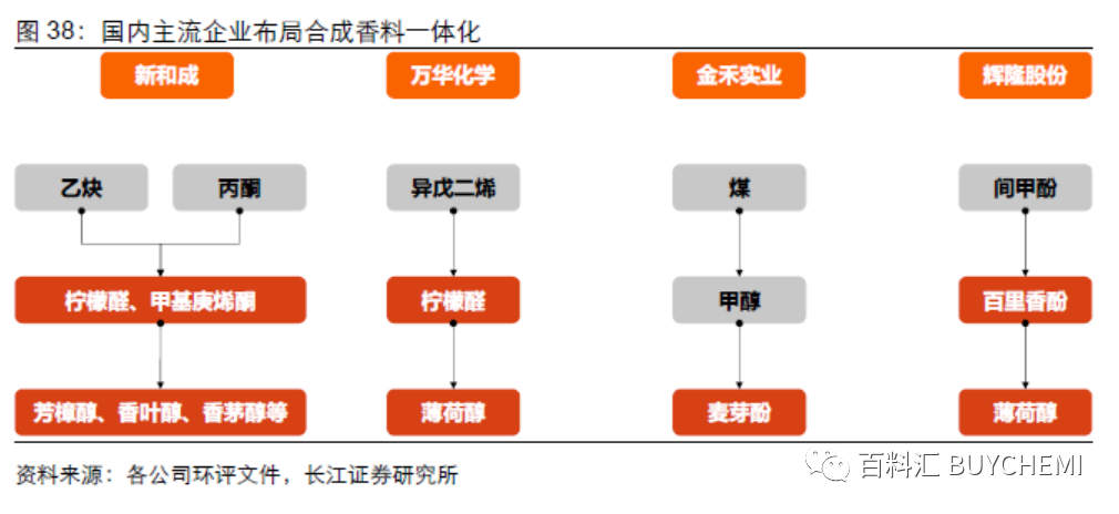 一體化布局,增強產(chǎn)業(yè)鏈競爭力。目前國內(nèi)合成香料企業(yè)新和成、萬華化學(xué)、金禾實業(yè)和輝隆股份均對原料一體化有所布局,能夠降低生產(chǎn)成本,提升生產(chǎn)供應(yīng)穩(wěn)定性。新和成布局檸檬醛和甲基庚烯酮核心產(chǎn)品,萬華化學(xué)布局檸檬醛,輝隆股份布局間甲酚產(chǎn)品。檸檬醛和間甲酚均具備較高的合成技術(shù)壁壘,能夠提升企業(yè)競爭實力。國內(nèi)合成香料企業(yè)在香精產(chǎn)品布局有限,未來若向下游布局香精產(chǎn)品,則有望進一步拓展產(chǎn)業(yè)鏈一體化完整度。