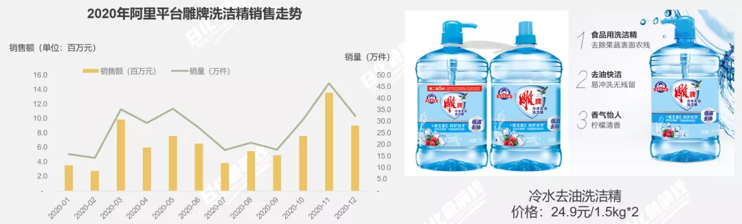 2020年阿里平臺洗潔精產(chǎn)品線上銷售額為11.9億元,同比增加24.6%。銷量約3700萬+件,同比增加32.9%。