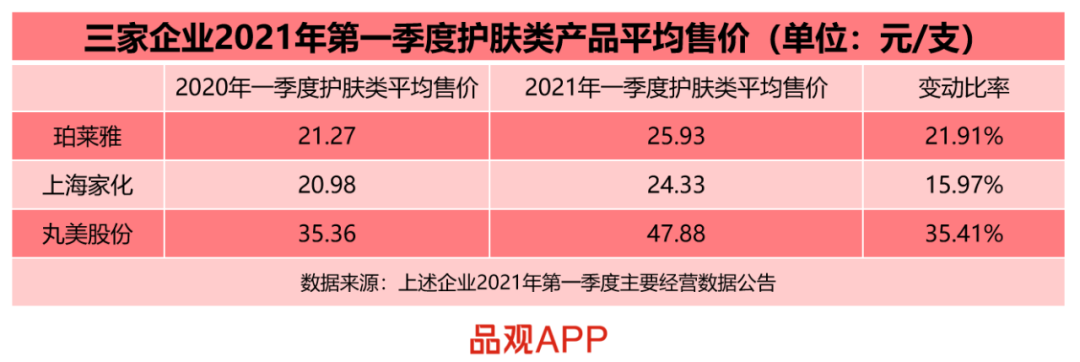 根據(jù)上述三家企業(yè)2021年一季度的財務數(shù)據(jù)可知,丸美股份護膚類產(chǎn)品平均售價以35.41%的漲幅居前,珀萊雅護膚類產(chǎn)品平均售價也達到了20%以上的漲幅,即便是漲幅最小的上海家化,其漲幅也達到了15.97%。