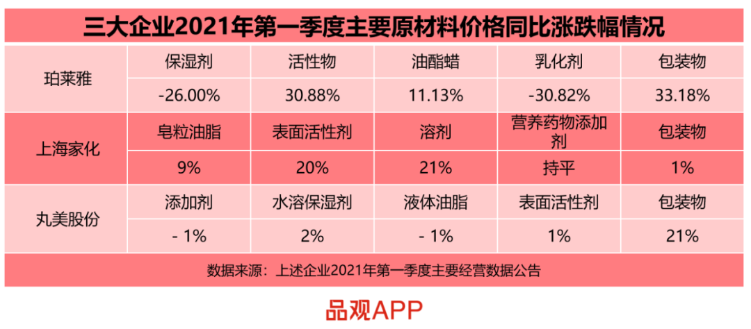 數(shù)據(jù)顯示,珀萊雅產(chǎn)品的主要原料保濕劑和乳化劑價格雖然出現(xiàn)下滑,但活性物、包裝物等原材料價格均呈現(xiàn)超30%的上漲。