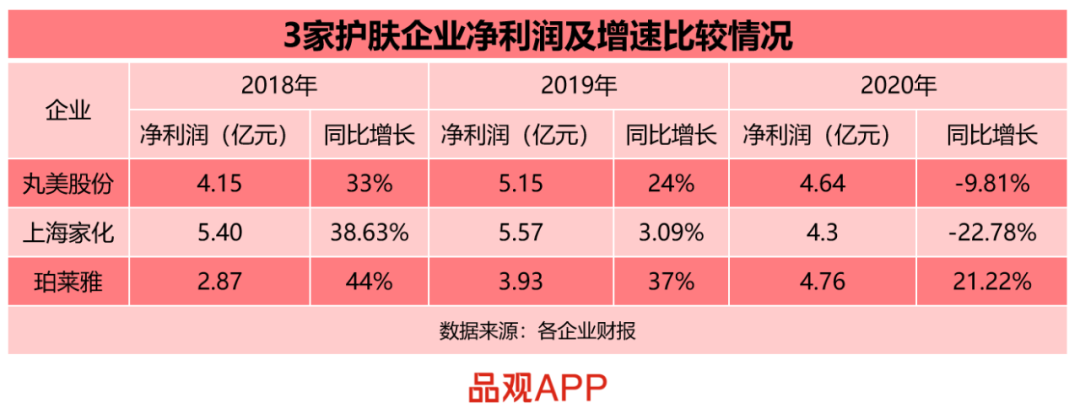2018年至2020年,上述三家企業(yè)的凈利潤增長均呈放緩狀態(tài)。其中,丸美股份和上海家化的凈利潤于2020年出現(xiàn)了負增長,而2018年及2019年凈利潤增長都超過37%的珀萊雅,在2020年的增速也降為21%。