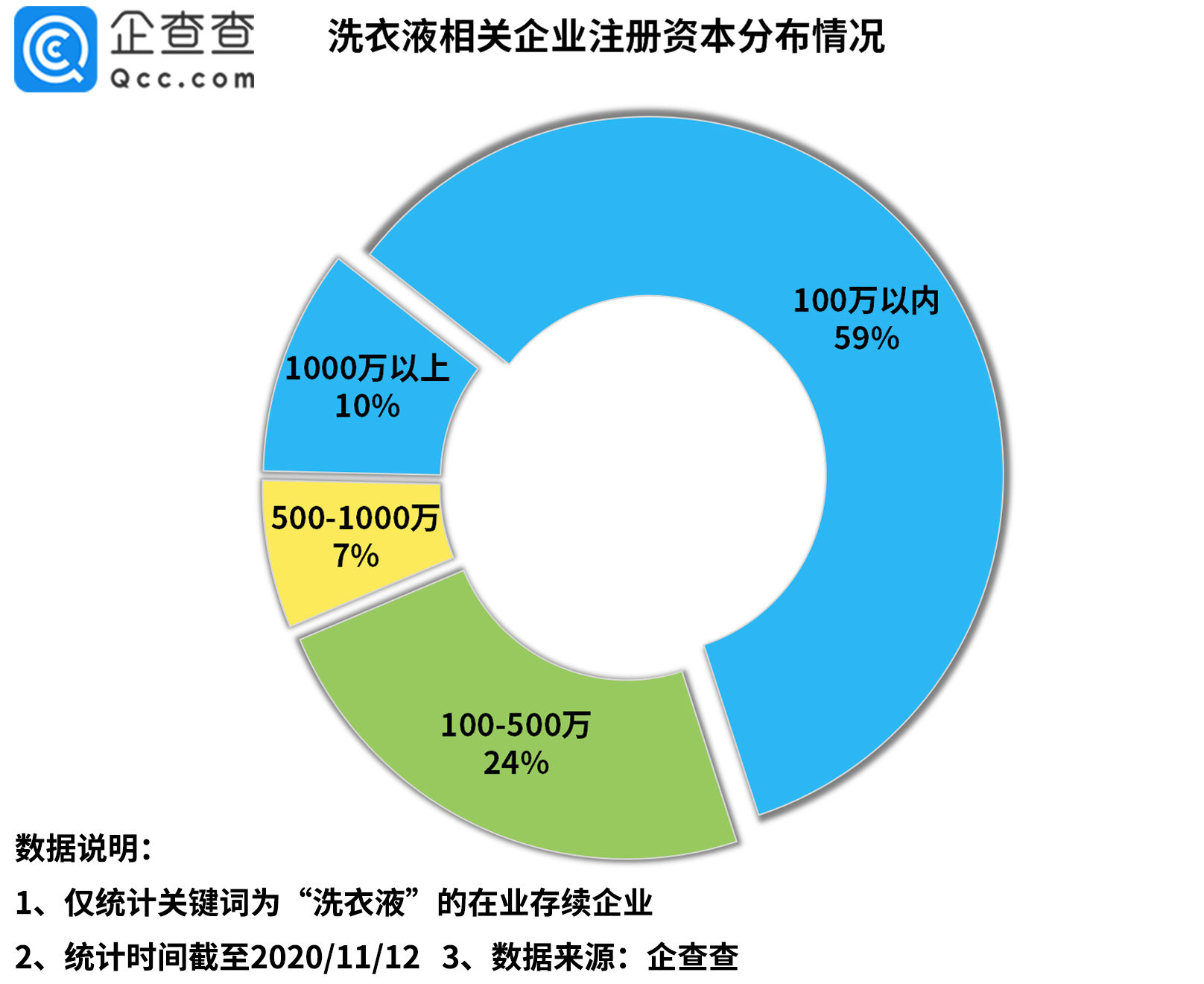 從注冊(cè)資本來看,企查查數(shù)據(jù)顯示,我國(guó)超8成的洗衣液相關(guān)企業(yè)注冊(cè)資本都集中在500萬以內(nèi),其中59%的企業(yè)注冊(cè)資本在100萬以內(nèi),24%的企業(yè)注冊(cè)資本在100-500萬這個(gè)區(qū)間,而注冊(cè)資本在1000萬以上的則占總量的10%。