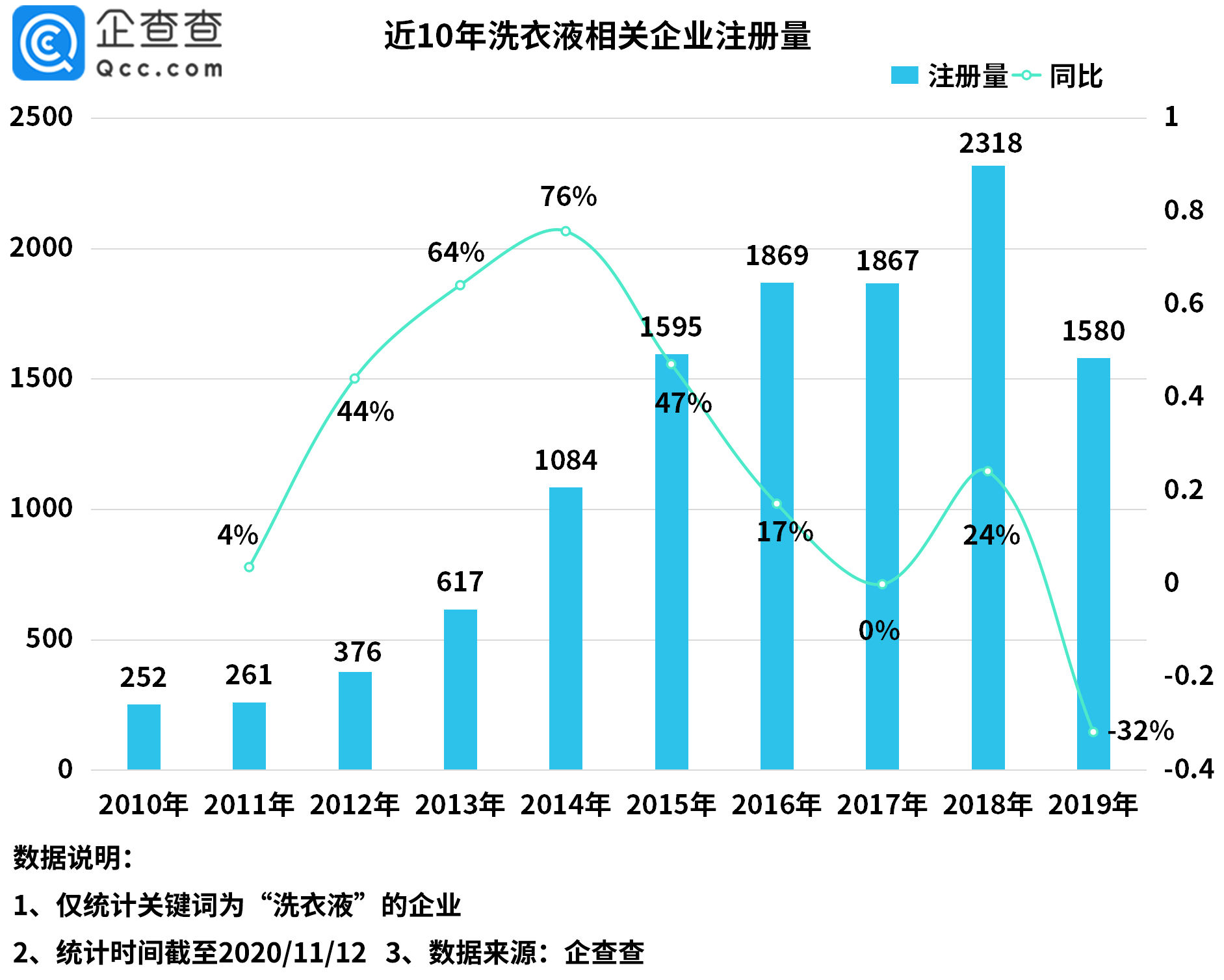 企查查數(shù)據(jù)顯示,2010-2018年我國(guó)洗衣液相關(guān)企業(yè)注冊(cè)量總體呈現(xiàn)增長(zhǎng)趨勢(shì),2010-2013年均注冊(cè)量為377家,2014年增長(zhǎng)率是近10年來最高的,同比增長(zhǎng)76%,注冊(cè)量達(dá)1084家。2018年注冊(cè)量是近10年來最高的,共新增2318家,同比增長(zhǎng)24%。2019年稍有下降,新增1580家,同比下降32%。