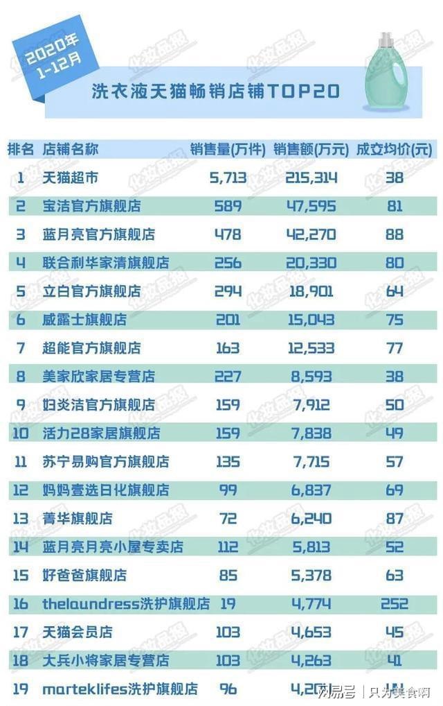 、寶潔官方旗艦店與聯(lián)合利華家清旗艦店,成交均價分別為87元、81元與80元。菁華系威萊集團旗下品牌,明星單品是王子菁華洗衣凝珠。榜單19位的Marteklifes(馬泰克)則是來自美國的日化品牌,主推小香水小蘇打洗衣液、嬰幼兒孕婦內(nèi)衣洗衣液、抑菌除螨洗衣液等產(chǎn)品,2020年,該品牌天貓旗艦店洗衣液產(chǎn)品成交均價為44元。