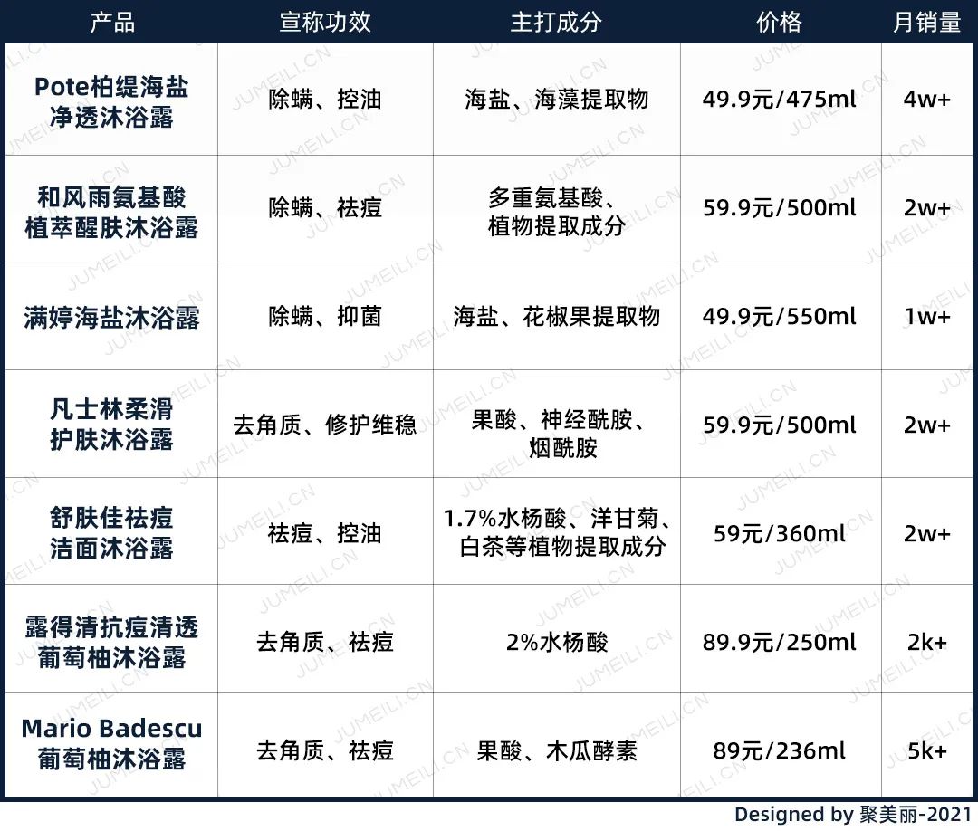 此外,近幾年以去角質(zhì)、祛痘為主要作用宣稱(chēng)的洗護(hù)產(chǎn)品中,水楊酸、果酸等“酸類(lèi)”成分也受到了高度關(guān)注。以下表格以沐浴露為例,不完全統(tǒng)計(jì)了淘寶平臺(tái)上不同價(jià)位銷(xiāo)量較高的功能性洗護(hù)產(chǎn)品。