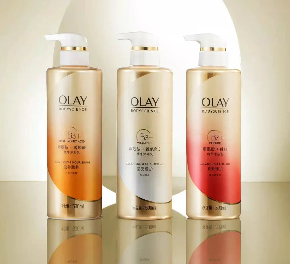 也有部分品牌不會(huì)直接宣稱(chēng)“可以潔面”,但會(huì)從護(hù)膚成分的角度進(jìn)行營(yíng)銷(xiāo)。比如,OLAY推出的精華沐浴露中,宣稱(chēng)添加了“面部護(hù)膚王牌成分煙酰胺”,并且根據(jù)主打功效的不同,推出不同的單品,將煙酰胺分別與肌肽、玻尿酸和維C等熱門(mén)護(hù)膚成分搭配使用。