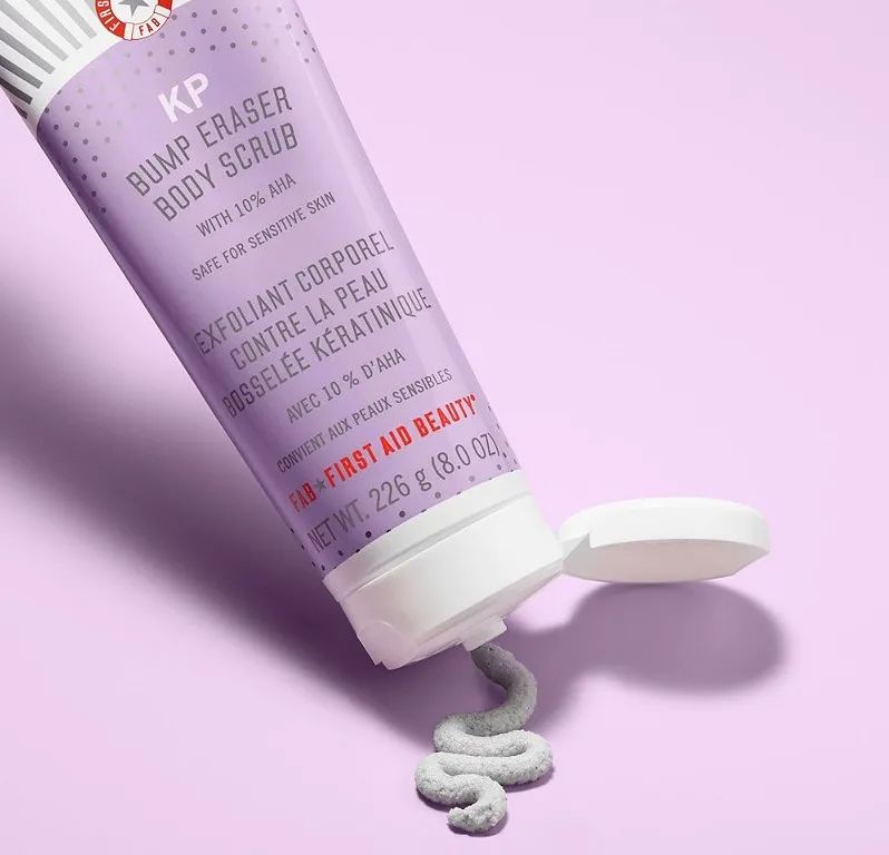 國(guó)外的一些功效護(hù)膚品牌也曾推出磨砂膏產(chǎn)品。比如,美國(guó)的敏感皮膚護(hù)理品牌 First Aid Beauty,曾推出含有10% 乙醇酸和乳酸的KP Bump Eraser 身體磨砂膏,其中添加了浮石拋光珠形式的物理去角質(zhì)劑,以及舒緩保濕成分紅沒(méi)藥醇、維生素E。據(jù)稱(chēng),該產(chǎn)品經(jīng)過(guò)皮膚科醫(yī)生測(cè)試,對(duì)去死皮和改善雞皮膚有一定作用。