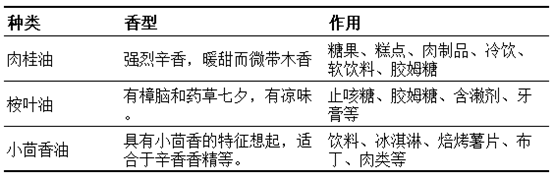 柑桔型香精(如甜橙、檸檬香精等)、果香型香精(如香蕉、草毒香精等)、薄荷型香精(如薄荷、留蘭香香精等)、豆香型香精(如香莢蘭、咖啡香料等)、辛香型香精(如肉豆蔻、肉桂香精等)、乳品型香精(如牛奶、白脫、乳酪香精)、肉香型香精(如牛肉、雞、魚類香精)、堅(jiān)果型香精(如杏仁、花生等)、酒香型、蔬菜型、焙烤型香精。