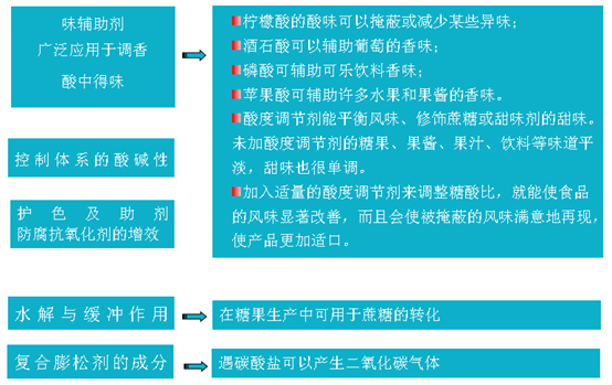 酸度調(diào)節(jié)劑通過陰離子影響食品風(fēng)味,一般有機(jī)酸具有爽快的酸味,而無機(jī)酸的酸味不很適口,如前所述的鹽酸、磷酸具有苦澀味,會使食品風(fēng)味變劣。