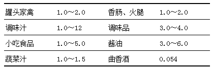 例如,配方:牛油5.5%,谷氨酸鈉17.8%,水解植物蛋白27.4%,2-甲基于-呋喃醇0.5%, 蔗糖11%,其他37.6%。